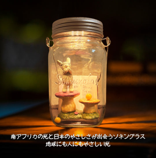 夜の森にそっと灯るような、やさしい光。白いうさぎのルミナが見つけた“ひかりのたね”をテーマにした、静かな癒しのソネングラスです。瓶の中には、小さな天然石の一粒“ひかりのたね”がそっと入っています。 太陽の光を受けて蓄えたエネルギーが、夜になるとやさしい灯りとして息づき、その光は心の奥にあるあたたかさをそっと映し出すよう。 忙しい日々の中で、ふと立ち止まりたくなるような静けさとぬくもりを届けます。 ~ Sonnenglas ソネングラス ~ 南アフリカで生まれたエコソーラーランタン。フェアトレードのもと、ひとつひとつ丁寧に手作りされています。昼間に太陽光を蓄え、夜になると瓶の中にあたたかな光を灯します。自然のエネルギーが生み出すやさしい灯りは心を静かに照らし、日々の暮らしに穏やかな時間を与えてくれます。 ガラス瓶の中は小さな世界を楽しむための空間。お気に入りのものを入れて、自分だけの灯りを楽しむことができます。 南アフリカの光と日本のやさしさが出会うソネングラス。地球にも人にも優しい灯りです。 ・ソネングラス 直径約11.5(持ち手含まず)×高17.5㎝・豆本(閉じた状態) 縦7.5×横5㎝・ウサギ(きのこ台座付き) 横8×奥5.5×高11㎝